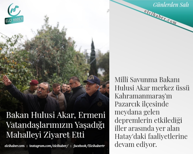 Millî Savunma Bakanı Hulusi Akar beraberinde Genelkurmay Başkanı Orgeneral Yaşar Güler ile 6 Şubat’ta merkez üssü Kahramanmaraş'ın Pazarcık ilçesinde 7,7, Elbistan ilçesinde ise 7,6 büyüklüğündeki depremlerin etkilediği iller arasında yer alan Hatay'daki faaliyetlerine devam ediyor. Bakan Akar depremde zarar gören Samandağ ilçesine bağlı Hıdırbey ile Ermeni vatandaşların yaşadığı Vakıflı Mahallelerinde inceleme ve ziyaretlerde bulundu.