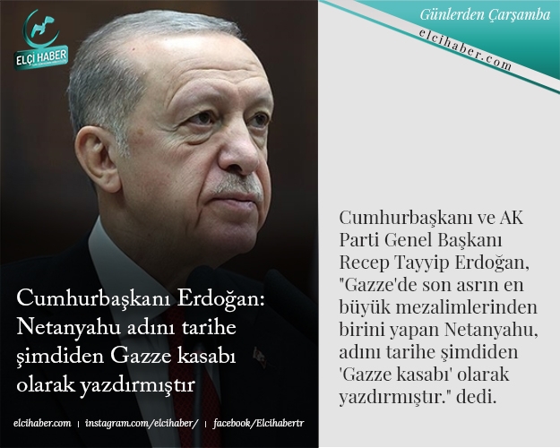 Cumhurbaşkanı ve AK Parti Genel Başkanı Recep Tayyip Erdoğan, "Gazze'de son asrın en büyük mezalimlerinden birini yapan Netanyahu, adını tarihe şimdiden 'Gazze kasabı' olarak yazdırmıştır." dedi.