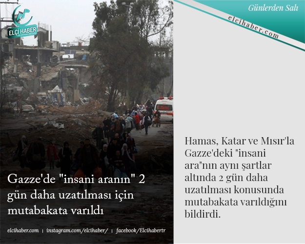 Hamas, Katar ve Mısır'la Gazze'deki "insani ara"nın aynı şartlar altında 2 gün daha uzatılması konusunda mutabakata varıldığını bildirdi.
