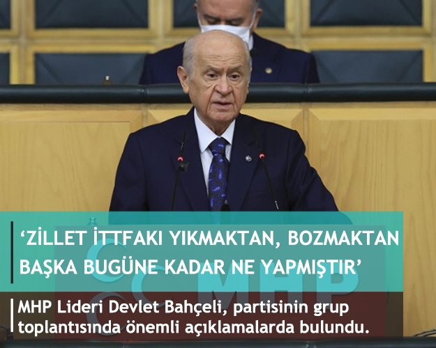 MHP Lideri Devlet Bahçeli, partisinin grup toplantısında önemli açıklamalarda bulunuyor. Bahçeli konuşmasında, "Zillet ittifakı yıkmaktan, bozmaktan, akıntıya karşı kürek çekmekten başka bugüne kadar ne yapmıştır." dedi.