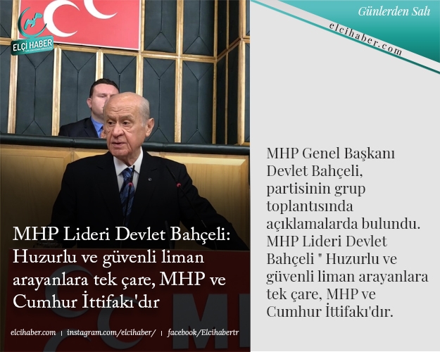 MHP Genel Başkanı Devlet Bahçeli, partisinin grup toplantısında açıklamalarda bulundu. MHP Lideri Devlet Bahçeli " Huzurlu ve güvenli liman arayanlara tek çare, MHP ve Cumhur İttifakı'dır.