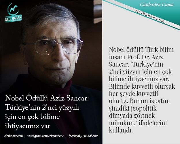 Nobel ödüllü Türk bilim insanı Prof. Dr. Aziz Sancar, "Türkiye'nin 2'nci yüzyılı için en çok bilime ihtiyacımız var. Bilimde kuvvetli olursak her şeyde kuvvetli oluruz. Bunun ispatını şimdiki jeopolitik dünyada görmek mümkün." ifadelerini kullandı.