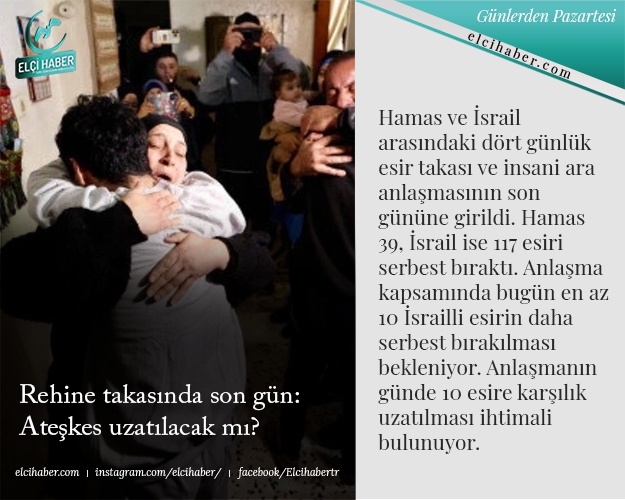 Hamas ve İsrail arasındaki dört günlük esir takası ve insani ara anlaşmasının son gününe girildi. Hamas 39, İsrail ise 117 esiri serbest bıraktı. Anlaşma kapsamında bugün en az 10 İsrailli esirin daha serbest bırakılması bekleniyor. Anlaşmanın günde 10 esire karşılık uzatılması ihtimali bulunuyor.