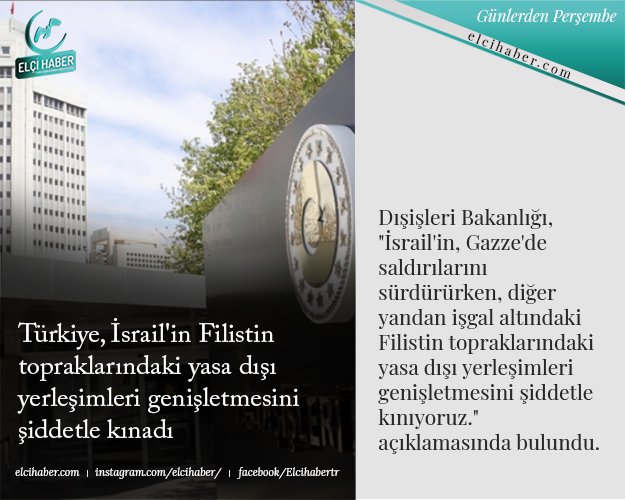 Dışişleri Bakanlığı, İsrail’in işgal altında bulunan Filistin topraklarındaki yasa dışı yerleşim faaliyetlerine ilişkin, "İsrail makamlarının, bir yandan Gazze’deki sivil halka yönelik barbarca saldırılarını sürdürürken diğer yandan işgal altındaki Filistin topraklarındaki yasa dışı yerleşimleri genişletmesini şiddetle kınıyoruz." ifadesini kullandı.